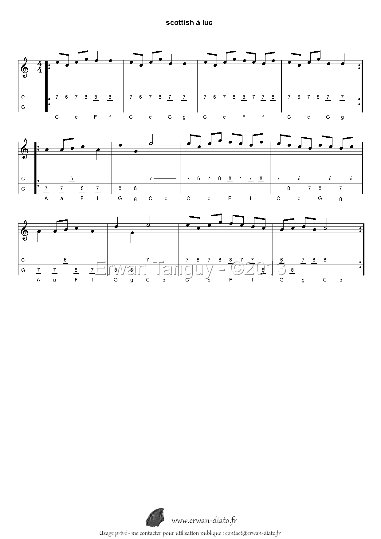 Sur certaines tablatures de la scottish à Luc, vous allez trouver un accord de Mi (qu'il soit majeur ou mineur importe peu à cet endroit), quatrième mesure de la deuxième pharse. Cet accord de Mi, accord de dominante, sert à introduire l'accord de La mineur.