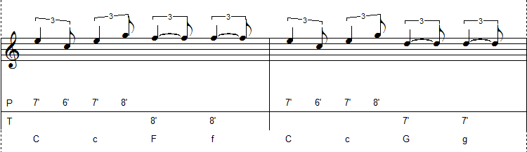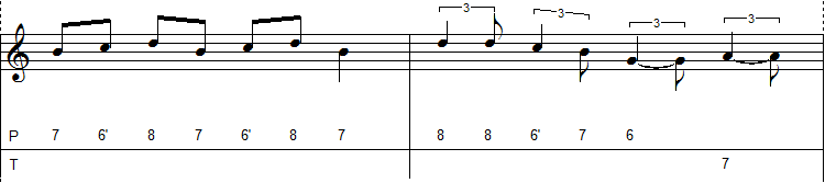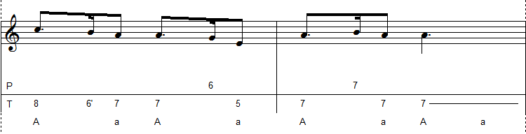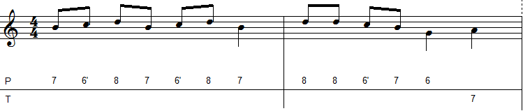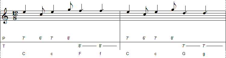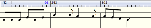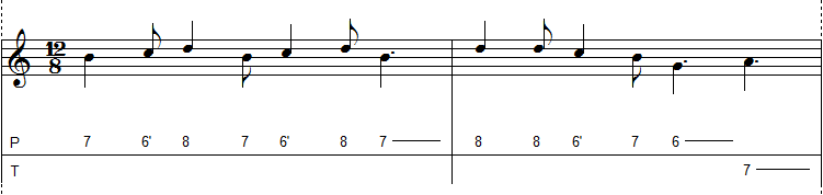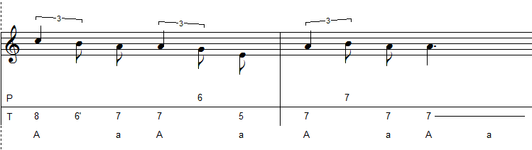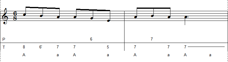 Dans cet exemple en 6/8, les temps sont divisés par trois, d'où le nom "rythme ternaire" ou "ternaire". Il n'y a cependant que deux temps dans la mesure, comme une mesure en 2/4.