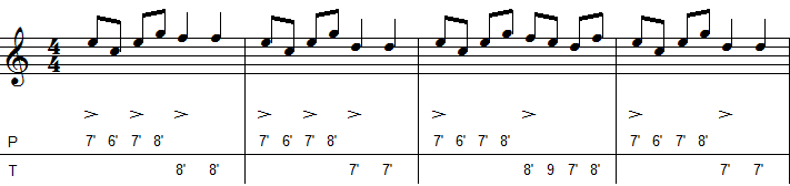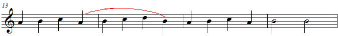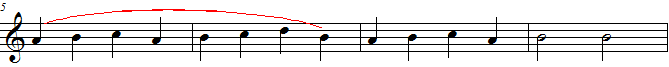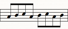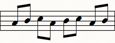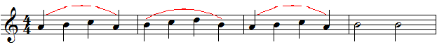 Voici un cas fréquent, l'accentuation d'un motif mélodique. Un motif mélodique c'est quoi ?...dans l'exemple suivant c'est "la si do", qu'on appelle motif puisqu'il est répété plusieurs fois. Plusieurs choix : soit on veut montrer qu'on a réussi à trouver un motif mélodique et on décide d'en accentuer à chaque fois la première note ; soit l'auteur l'impose.