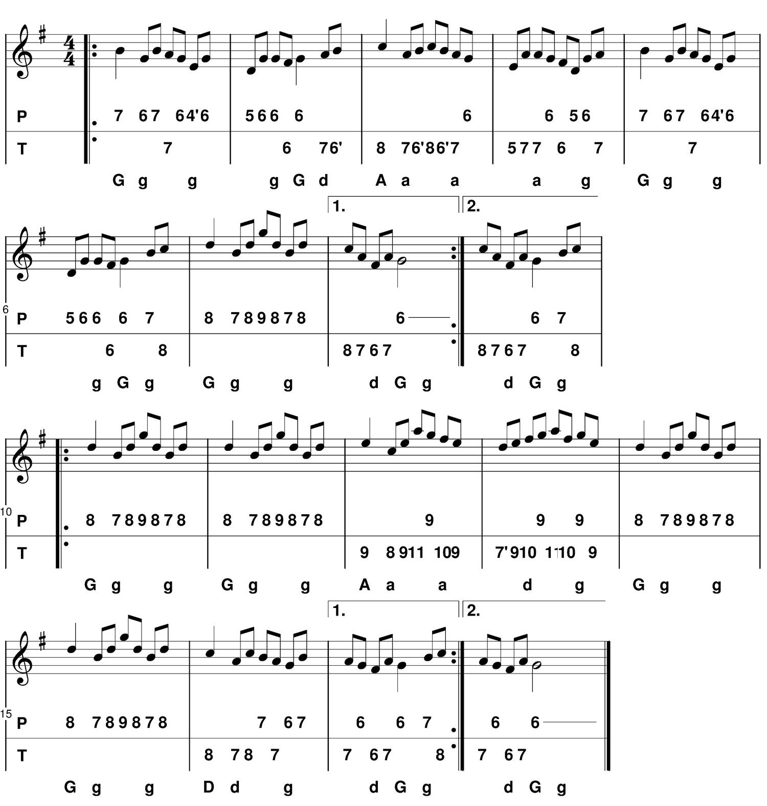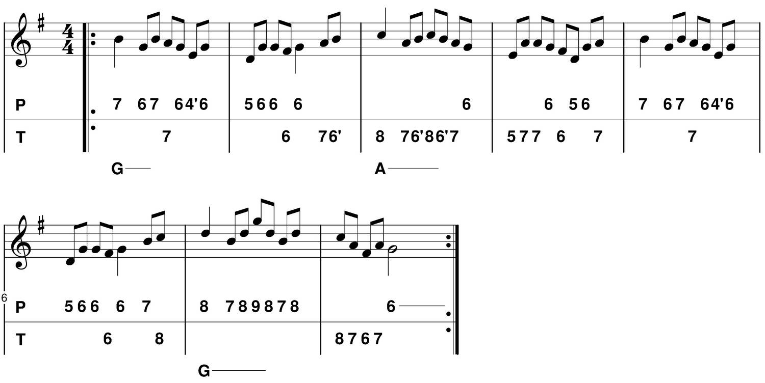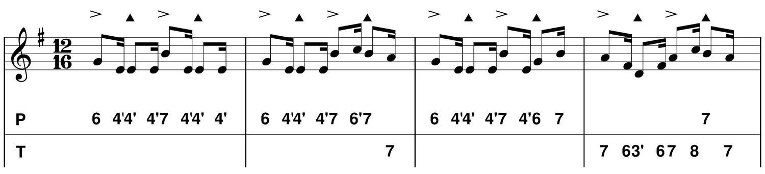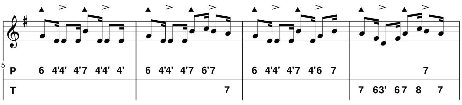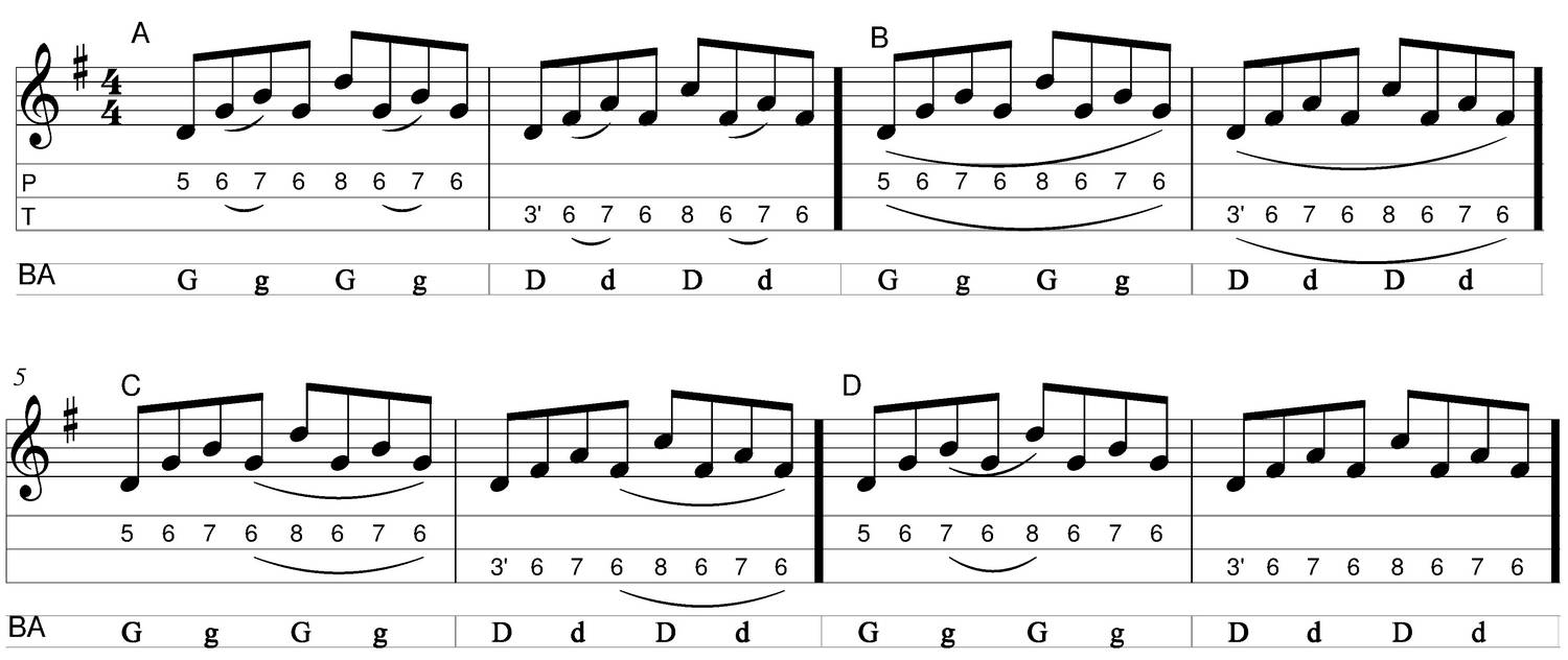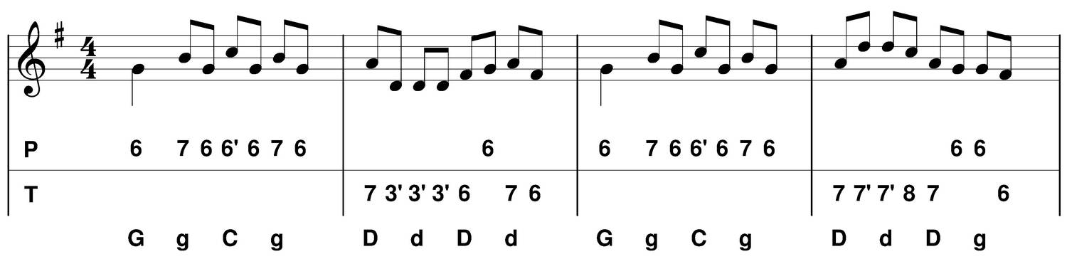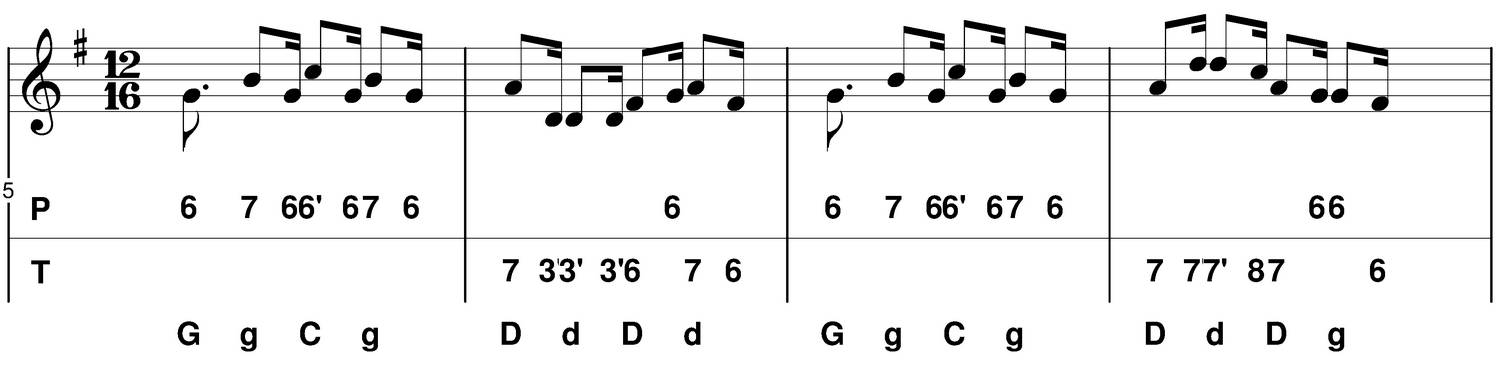 - C : je choisis de mettre en évidence un "picotage", la mélodie revient sur le sol (6 poussé) ou sur le fa# (6 tiré).