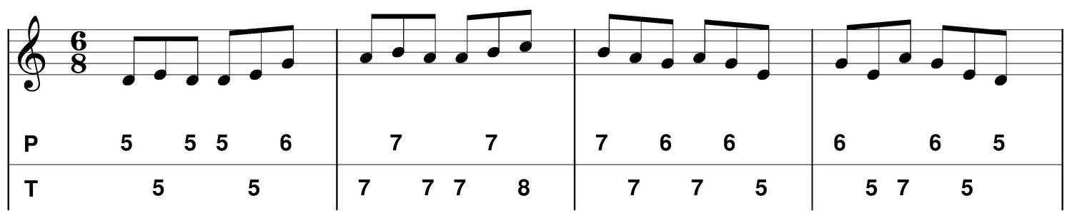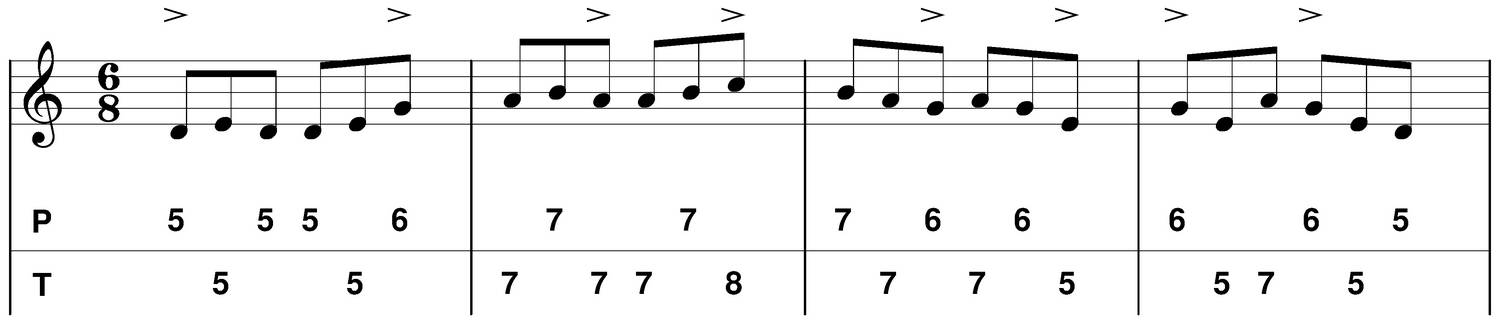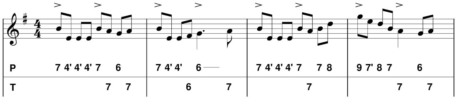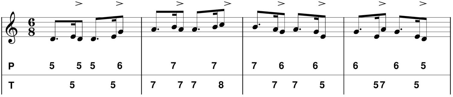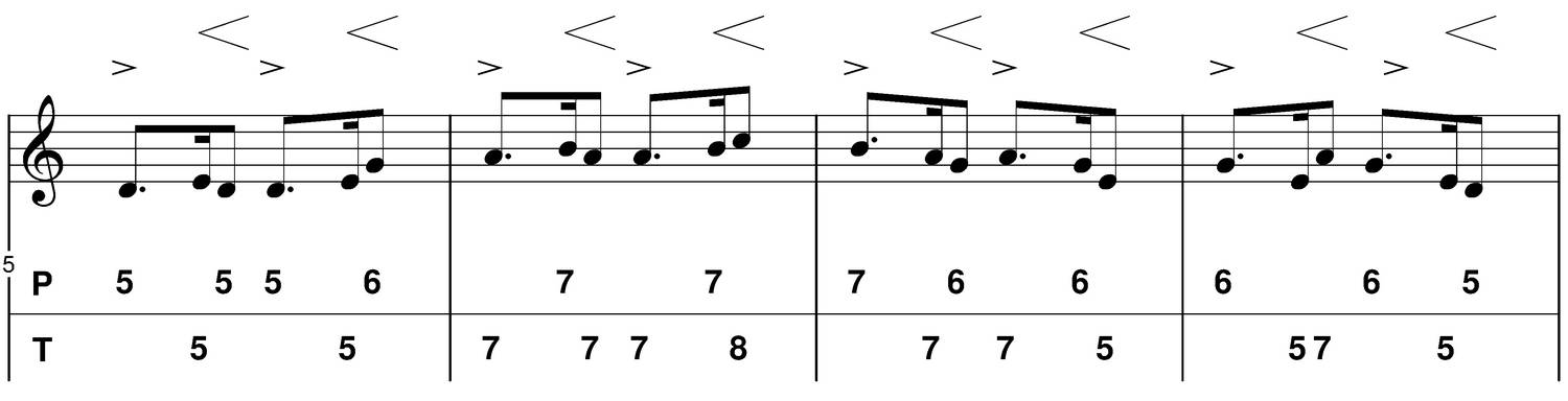 Les accents sont placés soit sur les temps, soit sur les contretemps ou les deux (plus rarement sur les jigs). J'appelle "temps" la première croche, et "contretemps" la troisième croche. Les croches 2 et 4 sont des temps faibles, on les accentue parfois (syncopes : beaucoop d'exemples : Liz Carroll, Martin Hayes, Padraig Rynne etc...), avant de les utiliser je vous conseille de pouvoir jouer à un tempo convenable, autrement cela ne sonnera pas trop "irish".