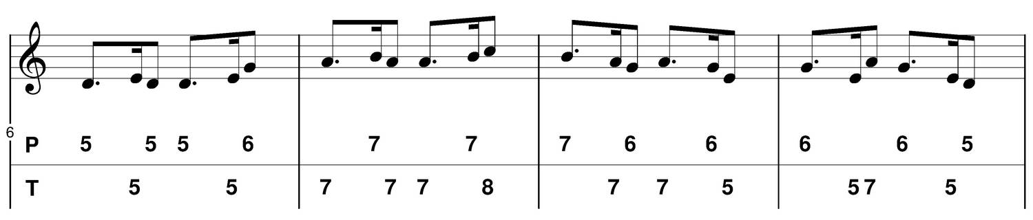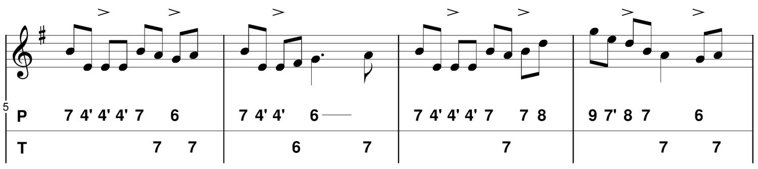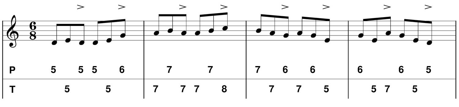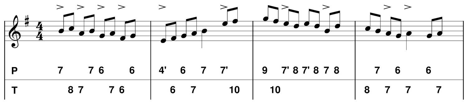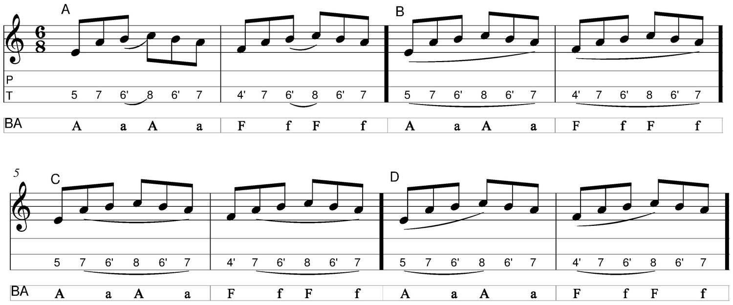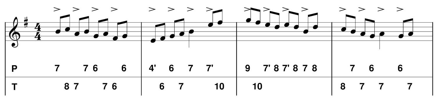 - Accents : forte (f) (indiqué par l'accent sur les tablatures ci-dessous)